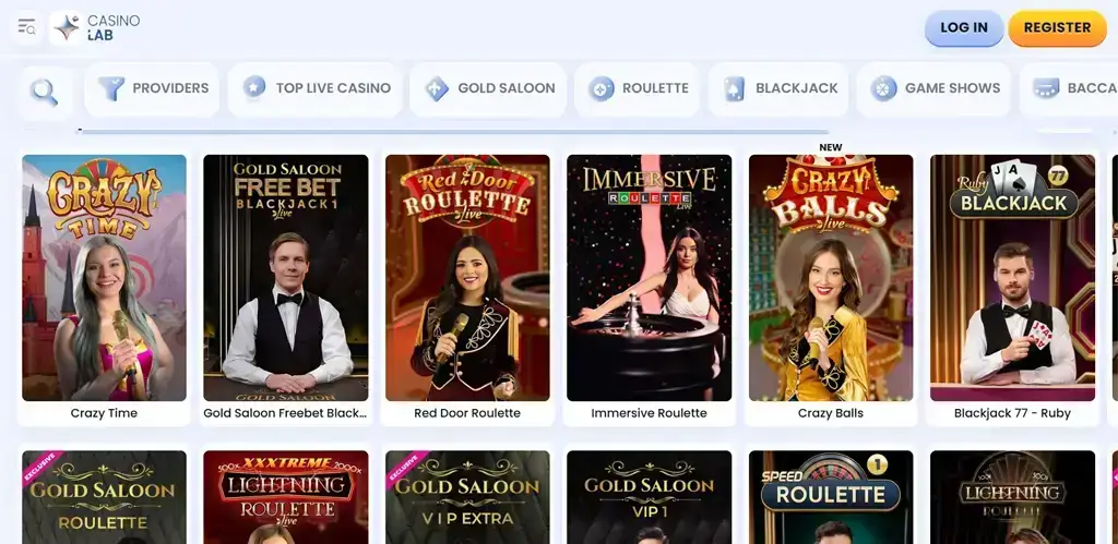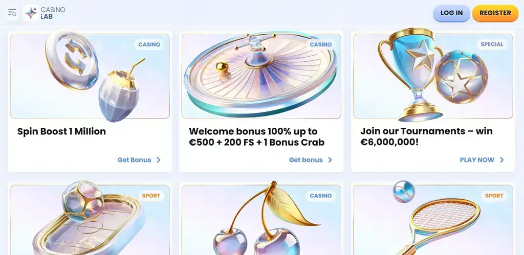 CasinoLab features a modern, minimalist design with a clean, light-colored interface. The layout is intuitive, making it easy to navigate through the main sections right from the homepage, even for new users.
